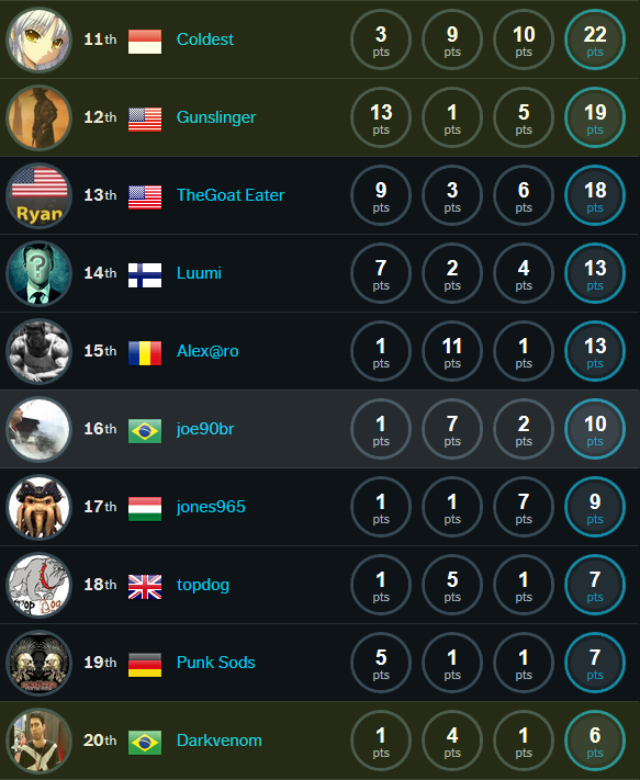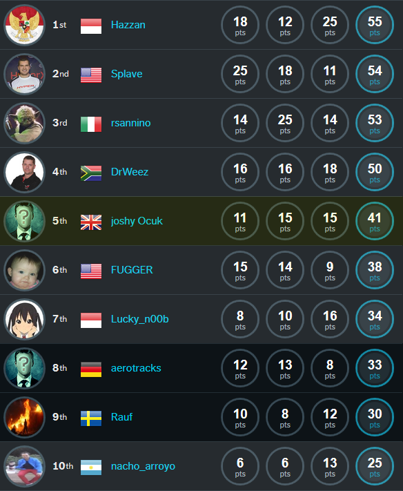 Сито отборочного этапа преодолели по два представителя из следующих регионов: EMEA (Европа, Ближний Восток, Африка), Азия, Северная Америка, Южная Америка. Соответственно, это Rsannino (Италия) и DrWeez (ЮАР), Hazzan и Lucky_n00b (Индонезия), Splave и Fugger (США), Nacho_arroyo (Аргентина) и Joe90br (Бразилия).