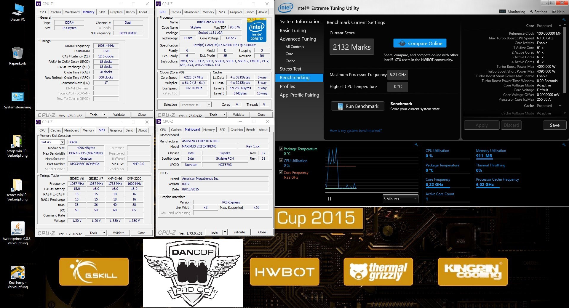 Процессор подвергся замораживанию жидким азотом и смог работать в тесте XTU на частоте 6226 МГц при всех четырех ядрах и активированном Hyper-Threading. Оперативная память HyperX на чипах AFR работала в режиме DDR4-3813 с задержками 12-18-18-28.