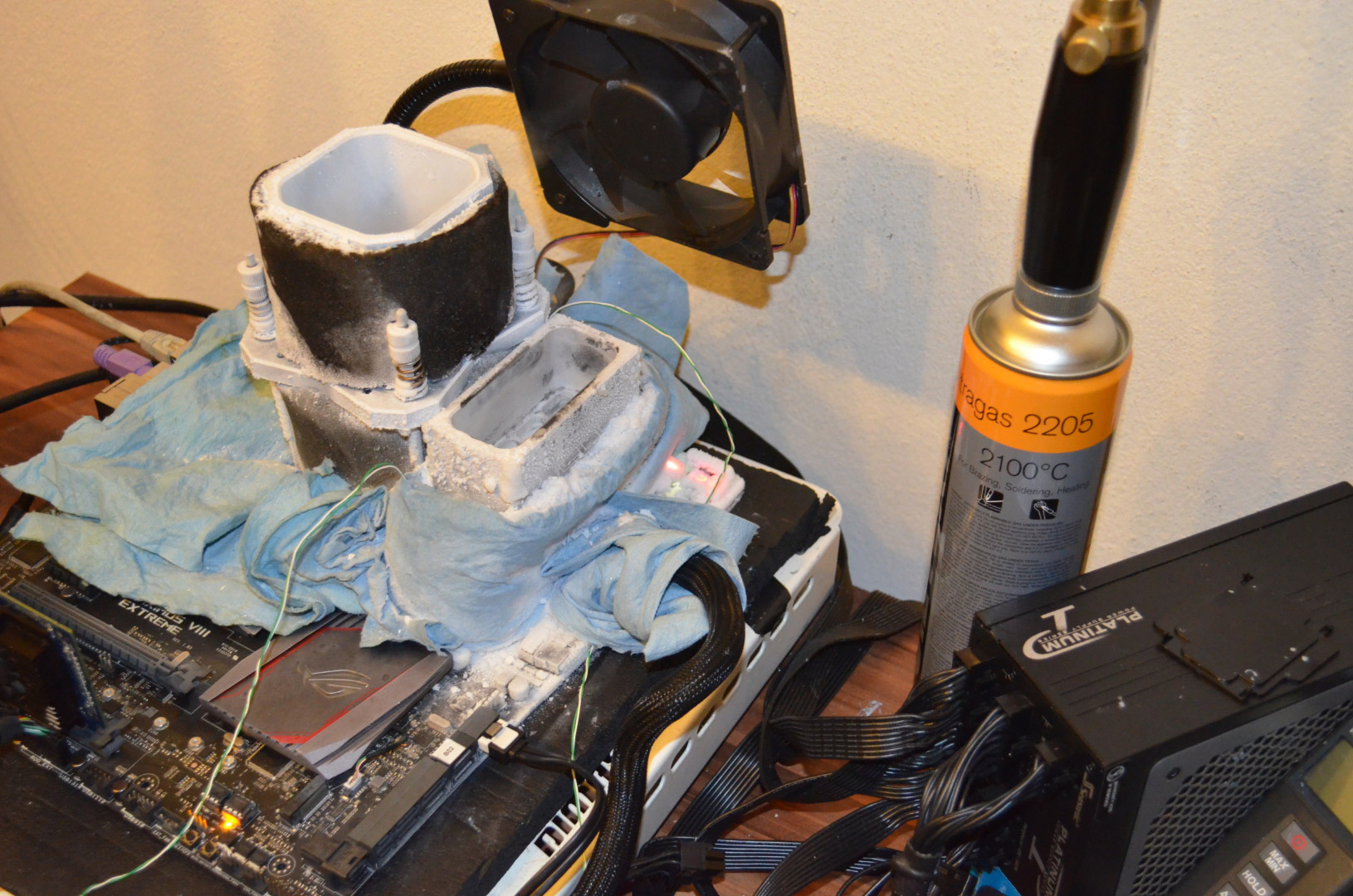 Основой стенда Даниэля служила материнская плата Asus Maximus VIII Extreme (чипсет Z170). Кроме того, в системе были задействованы блок питания Seasonic Platinum 1200W, видеокарта GeForce GT 620, испарители для LN2 и термопаста от 8ECC (Der8auer).
