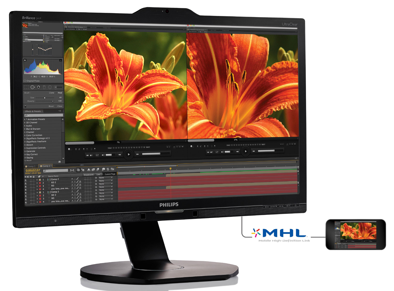 Продукт Philips 241P6VPJKEB весьма универсален: заявлено наличие интерфейса HDMI 2.0/MHL 3.0, 2-Мп веб-камеры с микрофоном и светодиодным индикатором, стереодинамиков, трех портов USB 3.0 типа A и одного USB 3.0 типа B, аудиовхода и аудиовыхода, замка Kensington и отверстий для крепления VESA 100x100 мм. Подставка позволяет регулировать высоту, наклонять и поворачивать экран. Среди прикладных характеристик выделим разрешение 3840x2160 точек, частоту обновления 60 Гц и значение максимальной яркости, равное 300 кд/м². Паспортные углы обзора — 178° по горизонтали и вертикали. Особо подчеркивается тот факт, что 241P6VPJKEB на 65% изготовлен из переработанного пластика.