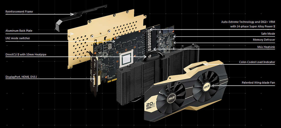 На плате распаяны элементы 14-канальной системы питания Super Alloy Power II, два разъема PCI-E Power 8-pin, пара коннекторов SLI, видеовыходы Dual-Link DVI-I, HDMI 2.0 и три DisplayPort 1.2. Помимо предустановленного кулера с центральной 10-мм тепловой трубкой, задействованы небольшой радиатор для VRM, фронтальное ребро жесткости и задняя усилительная пластина.