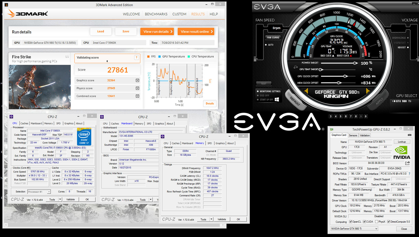 Американский мастер разгона K|ngp|n продолжает демонстрировать преимущества видеокарты EVGA GeForce GTX 980 Ti K|ngp|n, один из экземпляров которой, как оказалось, способен проходить тяжелые тесты на частоте ядра 2202 МГц — рекордной для GPU архитектуры Maxwell. В режиме 2202/8680 МГц (ядро/память) карта прошла все необходимые подтесты 3DMark Fire Strike, Fire Strike Extreme и Fire Strike Ultra с результатом 27861, 14432 и 7736 очков соответственно.