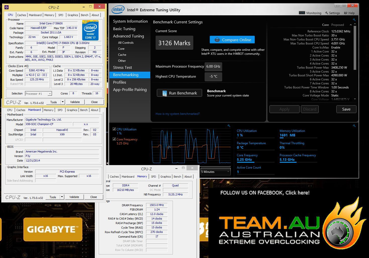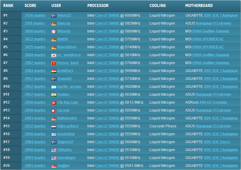 Кажется, оверклокинг постепенно становится национальным видом (кибер-)спорта в Австралии: мастера разгона из этой страны взяли верх в двух последних чемпионатах HWBot Country Cup и прилагают все усилия, чтобы завоевать первое место и в 2015-м. По итогам недавней бенч-сессии австралийцы побили мировой рекорд в бенчмарке XTU, подняв планку до 3126 очков. Как видно из нижеприведенной таблицы, данный результат — первый на частоте процессора Intel Core i7-5960X в 6 ГГц (максимальная).