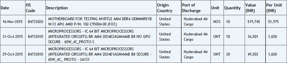 Журналисты ресурса WCCFtech сообщили о появлении в онлайн-сервисе Zauba, отслеживающем индийский импорт, записей о прибытии в международный аэропорт города Хайдарабад (штат Телангана) тестовых образцов материнских плат Socket AM4 для будущих APU от AMD. Груз прибыл в Индию больше месяца назад, однако об этом стало известно профильным изданиям лишь на днях.