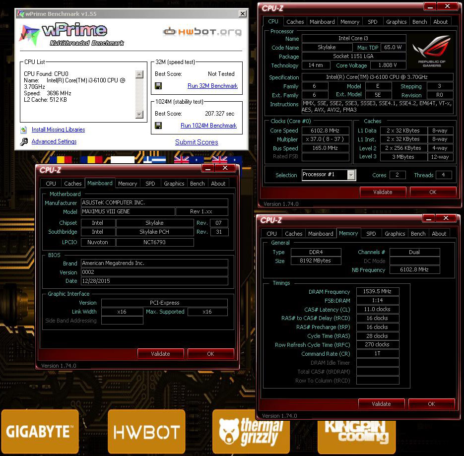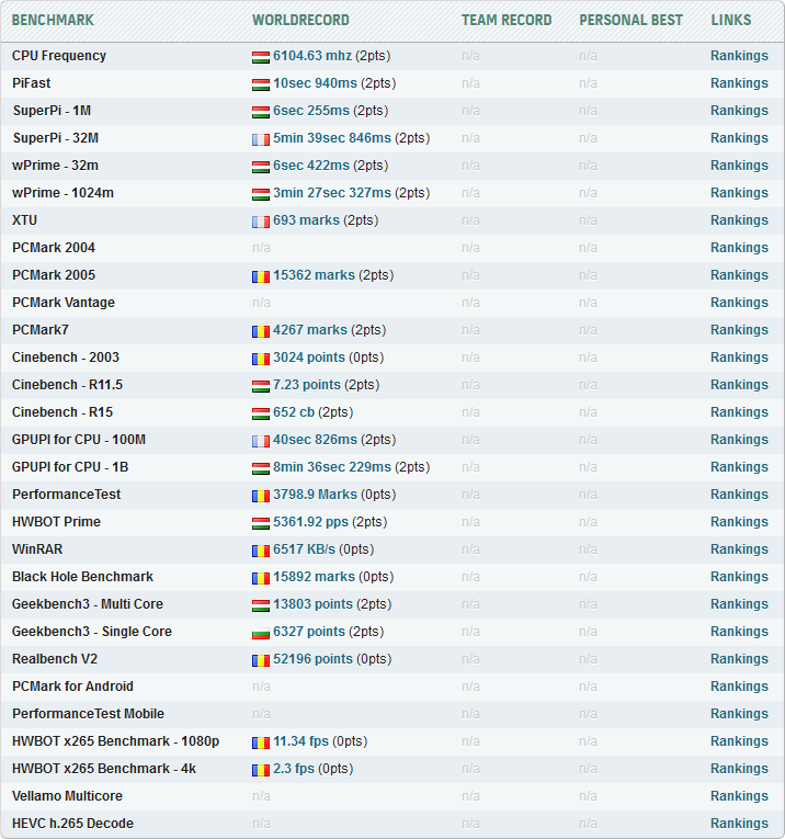 Кроме того, сегодня Achill3uS обновил собственный локальный рекорд в тесте wPrime 1024M (3:27,327) при частоте CPU 6102 МГц. Ему же принадлежат рекорды с использованием данного процессора в CPU Frequency (частота, считываемая посредством CPU-Z), SuperPi 1M, HWBot Prime, Geekbench 3 и GPUPi for CPU 1B. Другие бенчмарки, лучший результат в которых показан под венгерским флагом, — за партнером Achill3uS по Team Hungary с ником Jones965.
