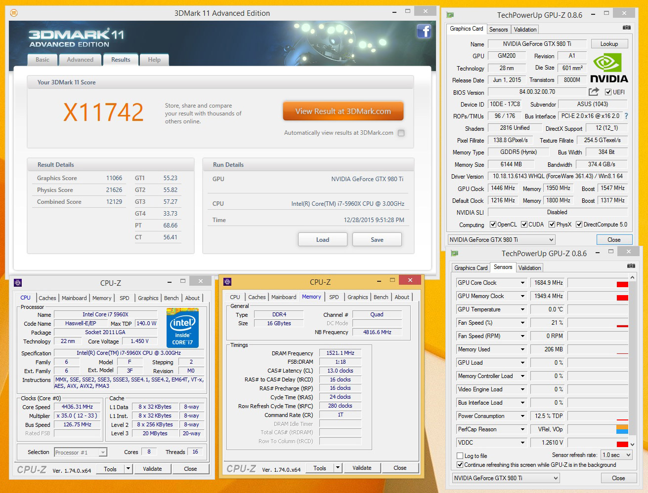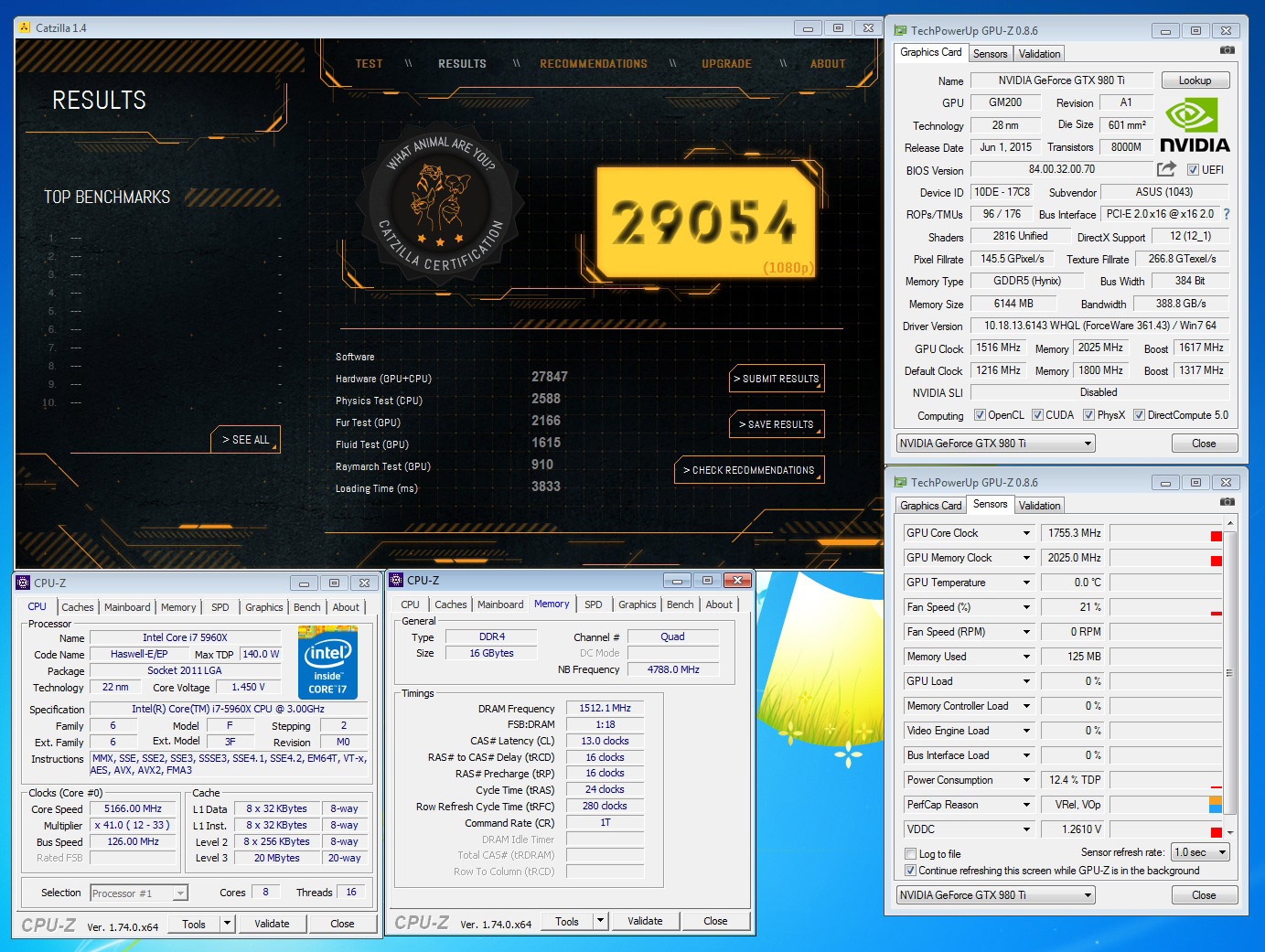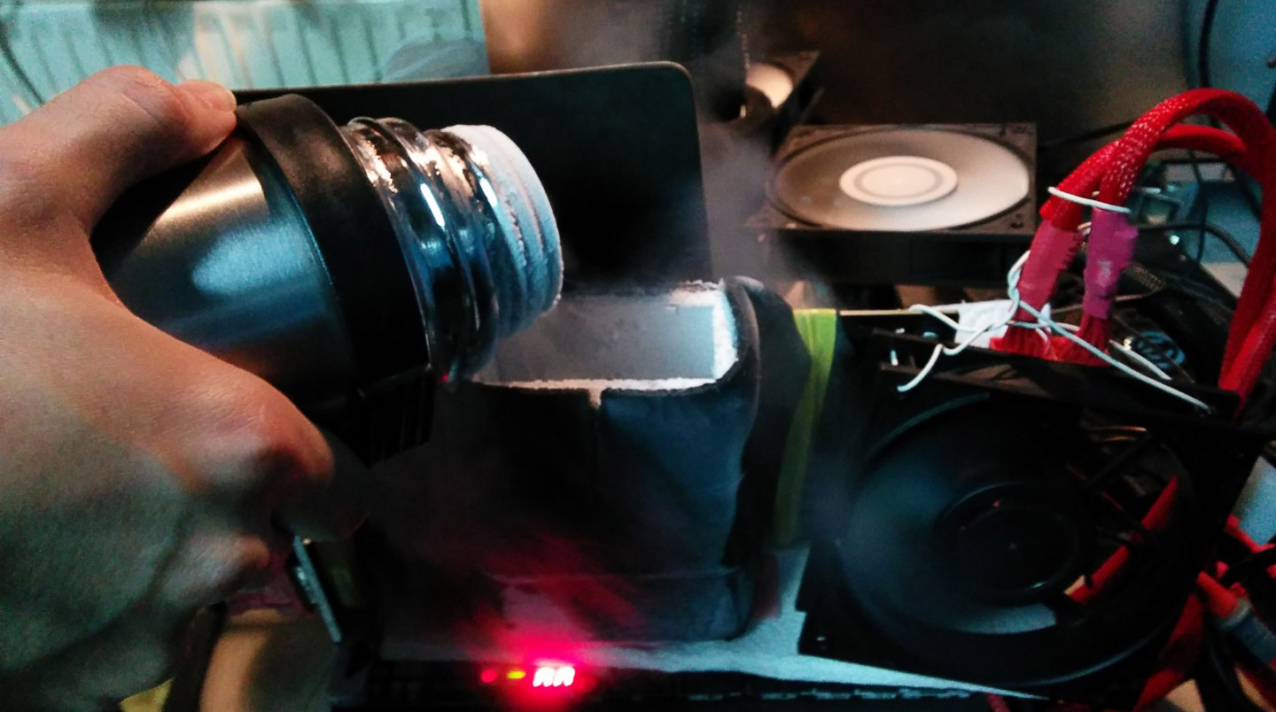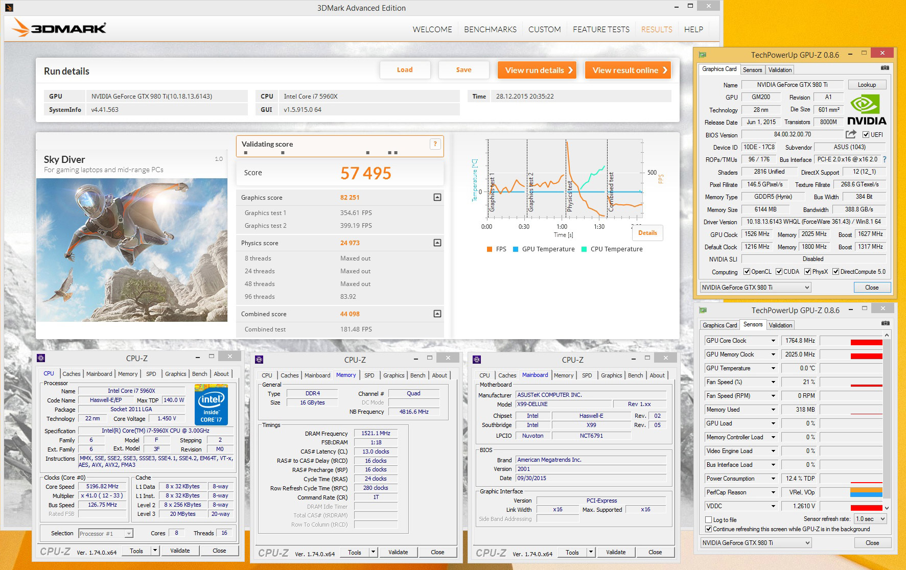 В примечаниях к результатам словенский мастер разгона написал следующее: «Алкогольно-оверклокерская вечеринка с моим приятелем Tiborrr. Использовалась розничная видеокарта Asus GeForce GTX 980 Ti Strix с испарителем EK-SF3D Critical Point. Напряжение на GPU составляло 1,5 В, температура понижалась до –115 °C. Процессор Core i7-5960X работал на частоте до 5,2 ГГц и охлаждался до –45 °C с помощью "фреонки" Tiborrr».