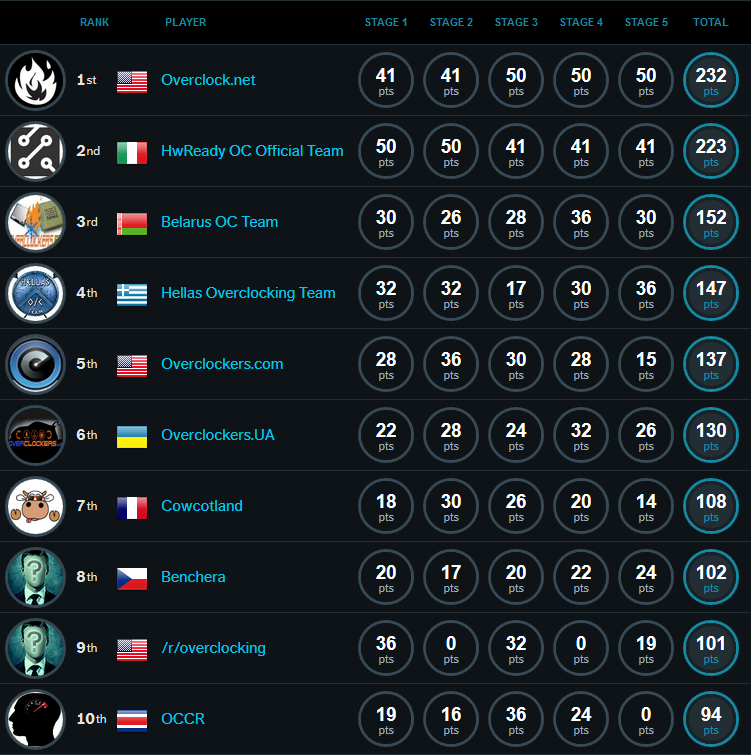 Призы в данном соревновании предусмотрены не были, но даже с учетом этого некоторые команды выложились по полной: итальянцы HwReady OC едва не огорчили фаворитов Overclock.net, а «бронзу» взяла команда из Беларуси, опередив некогда сильную греческую дружину.