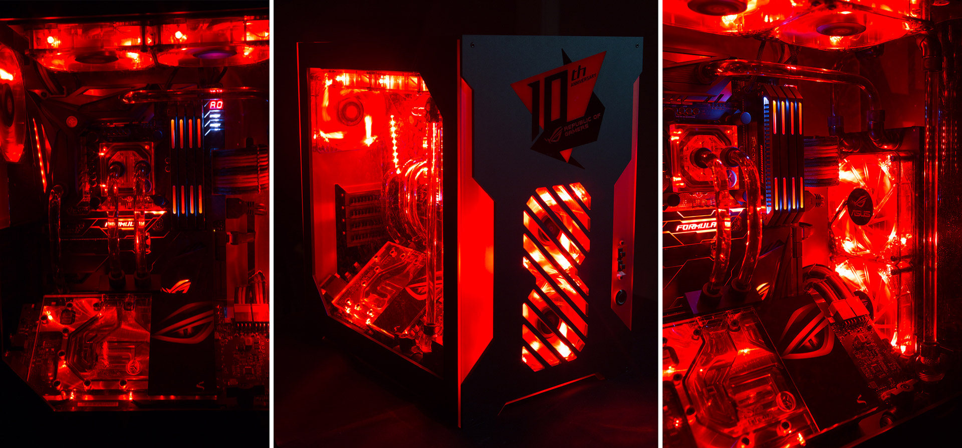 Участник сообщества Asus Republic of Gamers под ником Upsnef оказался в центре внимания после того, как его система Snef Devil's Eye была продемонстрирована на недавней выставке в Лас-Вегасе. Учитывая количество и яркость красных светодиодов, другие детали компьютера выглядят «особенно черными». На передней панели красуется надпись «10-летний юбилей Republic of Gamers».