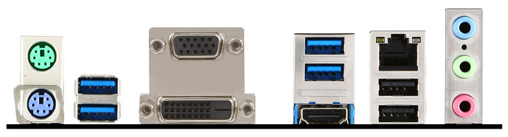 На задней панели немало разъемов для периферии, включая даже PS/2 и D-Sub. Портов USB 3.0 вдвое больше, чем разъемов предыдущего поколения. Последние нужны для некоторых старых моделей мышей с USB 2.0.