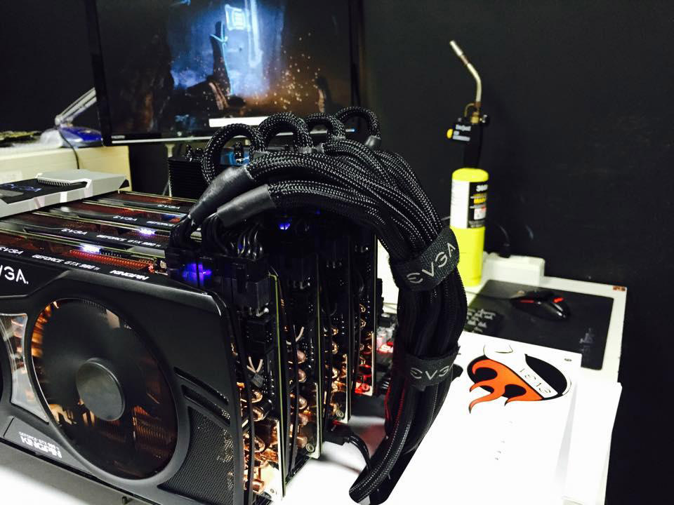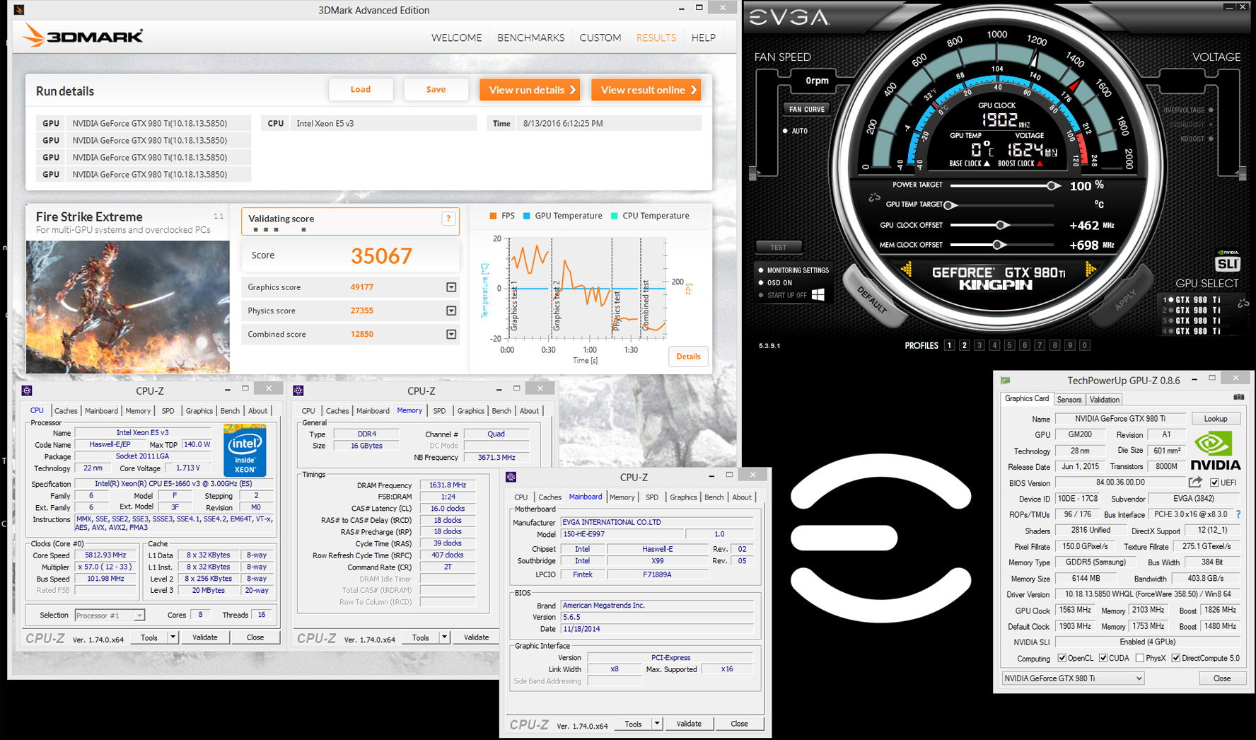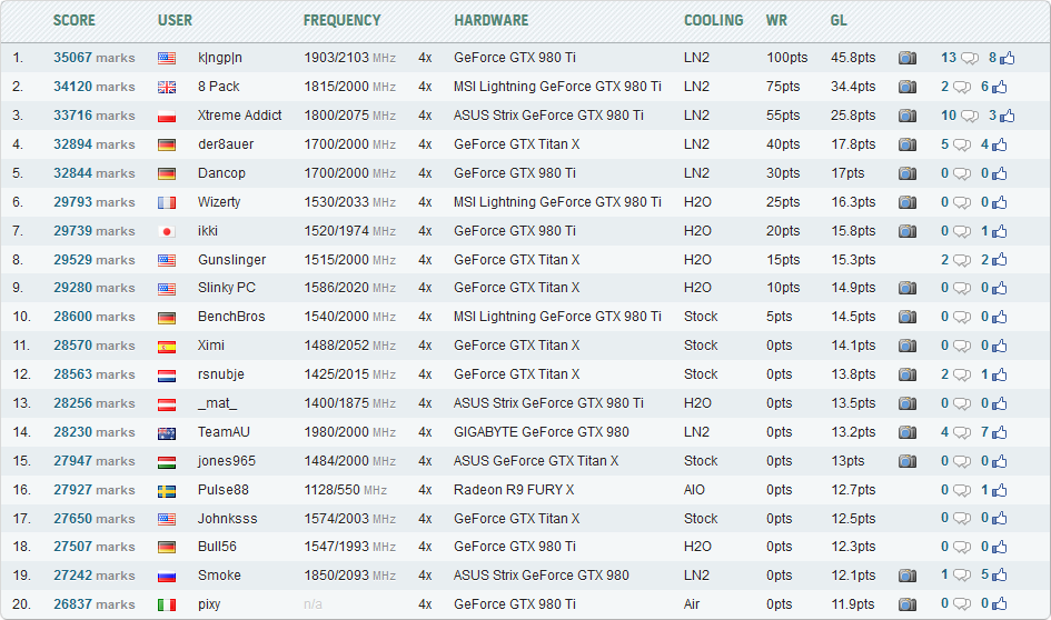 Квартет отборных видеоускорителей на чипе Nvidia GM200 подвергся экстремальному разгону до 1903/8412 МГц (ядро/память). Тесты проводились на материнской плате EVGA X99 FTW (код модели — 150-HE-E997) с использованием инженерного семпла 8-ядерного процессора Intel Xeon E5-1660 v3 (@5813 МГц), 16 ГБ оперативной памяти DDR4 @3264 МГц, блока питания EVGA SuperNova NEX1500 Classified и испарителей для жидкого азота Tek-9 (GPU) и Dragon F1 Extreme Dark (CPU) марки KingpinCooling.