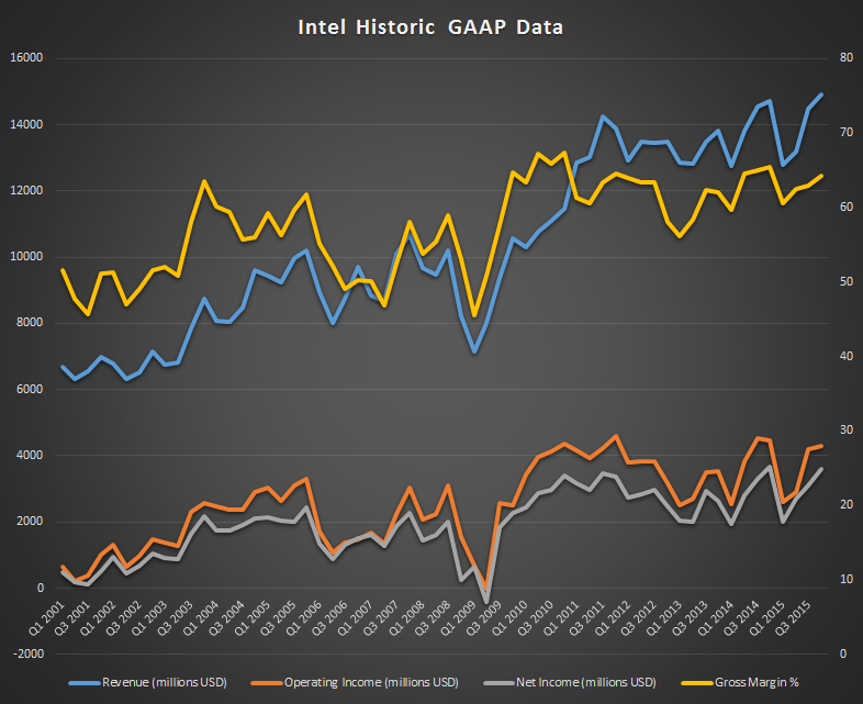 Ниже приведен поквартальный график за период 2001—15 гг., включающий доход (млрд долл., синяя кривая), валовую рентабельность (%, желтая кривая), операционную прибыль (млрд долл., оранжевая кривая) и чистую прибыль (млрд долл., серая кривая) Intel.