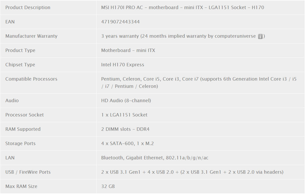 Несмотря на малые размеры, плата располагает вполне достаточным набором интерфейсов: распаяны два слота для ОЗУ DDR4-2133 (до 32 ГБ), четыре SATA 6 Гбит/с, единичные M.2 (32 ГБ/с) и PCI Express 3.0 x16. Кроме того, на панели ввода-вывода присутствует пара портов USB 3.1 Gen1 (~USB 3.0). Другие технические характеристики модели MSI H170I Pro AC приведены ниже: