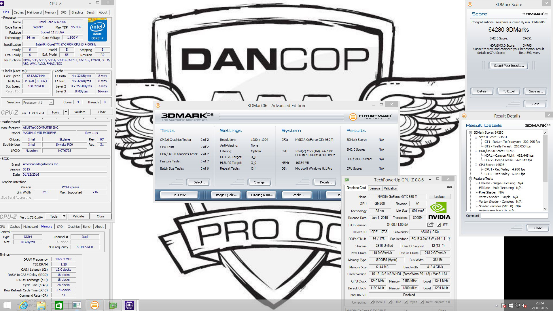 В конце недели Dancop установил три рекорда, в том числе один абсолютный — 64280 очков в 3DMark06. В старом тесте от Futuremark Даниэль использовал разогнанный до 6612 МГц процессор Intel Core i7-6700K, видеокарту Asus GeForce GTX 980 Ti Matrix Platinum (@1500/8612 МГц), материнскую плату Asus Maximus VIII Extreme, оперативную память G.Skill Trident Z DDR4 (@3744 МГц, CL12-18-18-28) и как минимум один 1200-ваттный блок питания серии Seasonic Platinum.