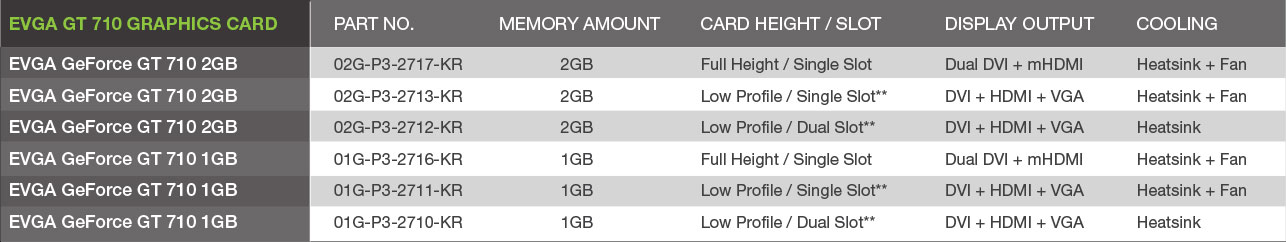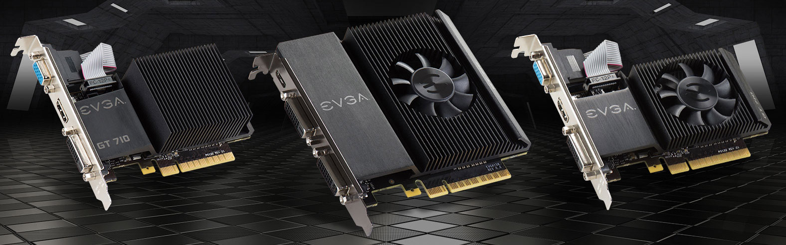 В январе AIB-партнеры Nvidia «обнаружили» у себя на складах «месторождения» чипов Kepler GK208. Как результат — на рынке появились десятки предложений класса GeForce GT 710 от известных производителей (MSI, Palit, Inno3D и др.). EVGA не осталась в стороне и выпустила шесть видеокарт на базе GPU GK208.