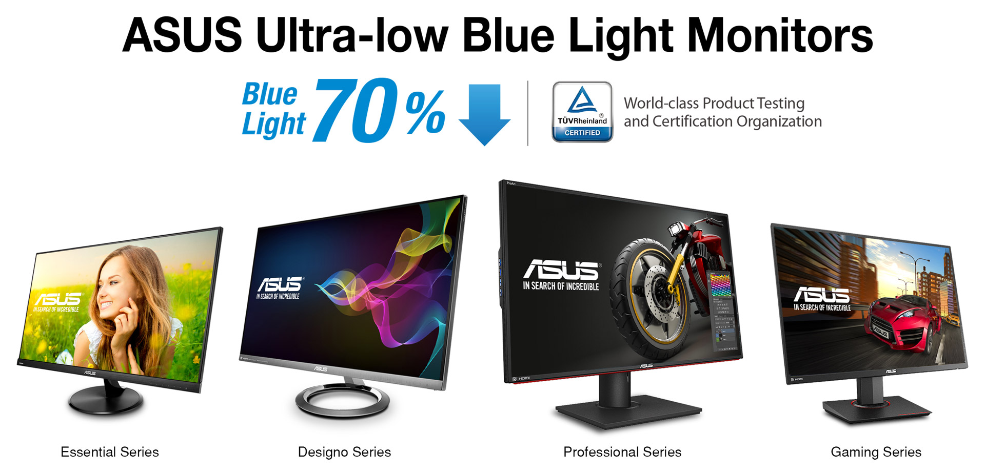 Asus анонсировала продажи на украинском рынке мониторов линейки VP — 21,5-дюймовых VP228H, VP228T и VP228TE, 23-дюймового VP239H, 24-дюймовых VP247H и VP247T, 27-дюймовых VP278H и VP278Q. Одной из ключевых особенностей новинок является применение технологии Ultra-Low Blue Light, которая позволяет, по выбору пользователя, уменьшить интенсивность синего свечения на 20—70%. Данную функцию удобно активировать, в частности, при чтении с экрана и работе с документами.
