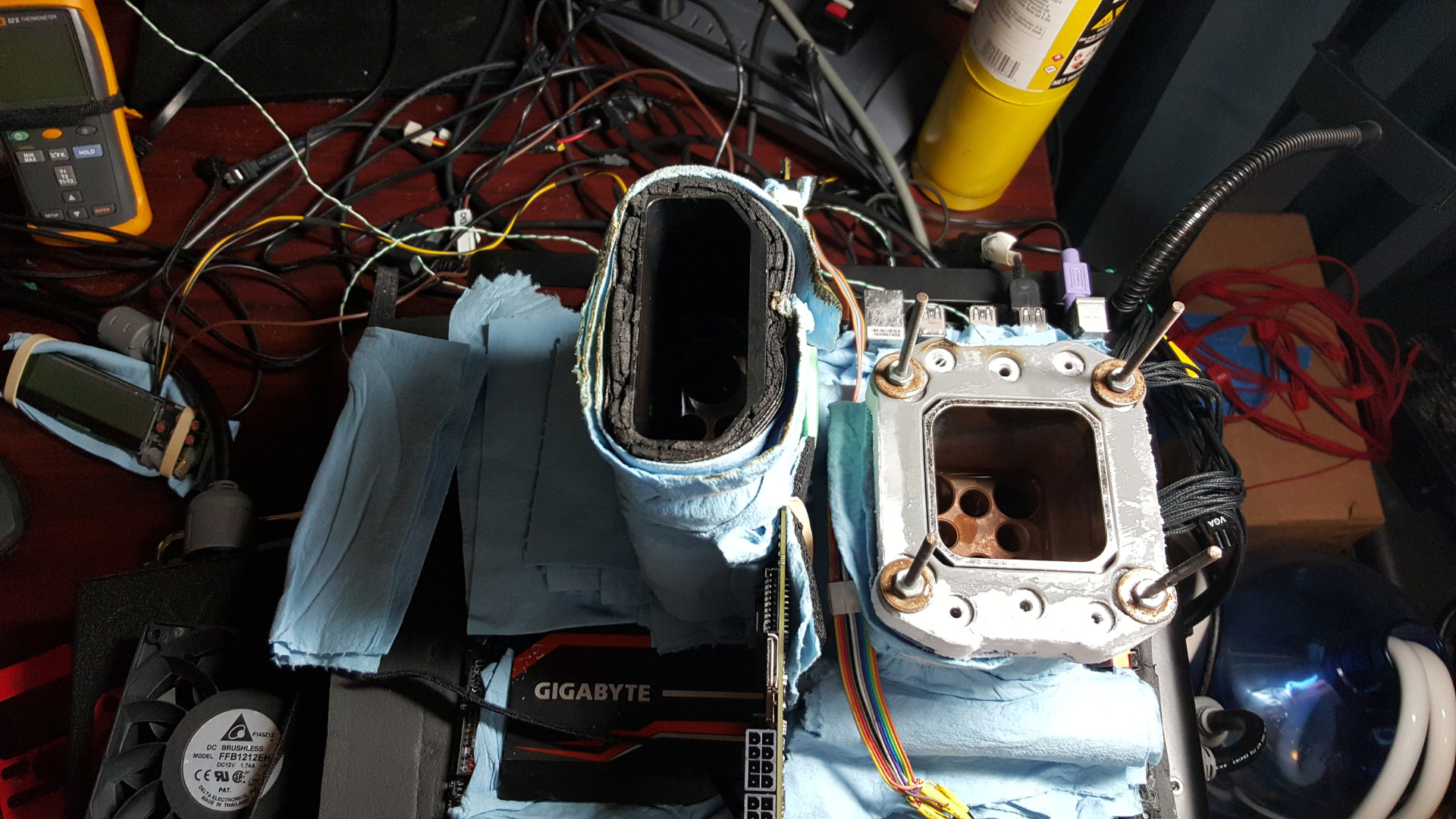 Основой оверклокерского стенда служила материнская плата Gigabyte GA-X99-SOC Champion. В системе, кроме прочих компонентов, были задействованы 16 ГБ оперативной памяти G.Skill DDR4 (@3080 МГц, задержки 11-13-15), блок питания EVGA SuperNova NEX1500 Classified и испарители для жидкого азота марки KingpinCooling для CPU и GPU.