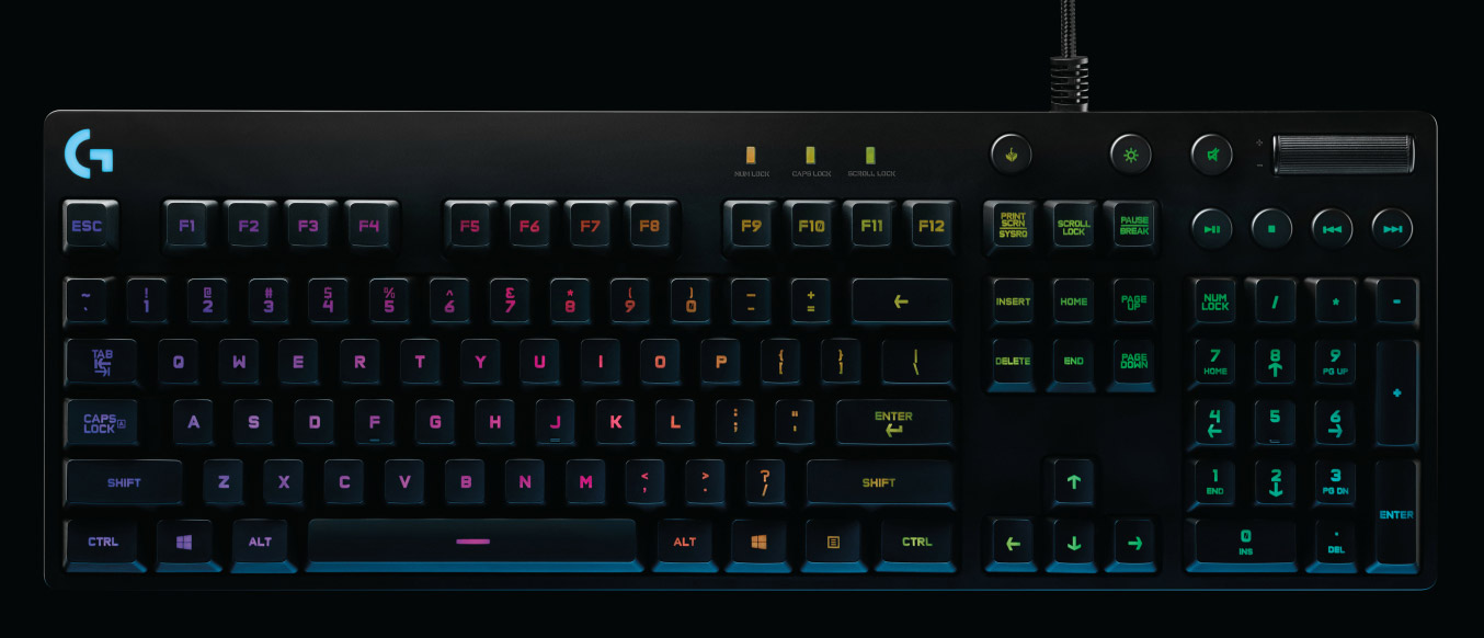 Матовая поверхность клавиш устойчива к отпечаткам пальцев. Раскладка привычная, мультимедийные клавиши (в том числе колесико регулировки громкости) сосредоточены в верхней правой части клавиатуры. Кнопкам F1—F12 можно присвоить макросы, а RGB-подсветка настраивается для каждой клавиши.