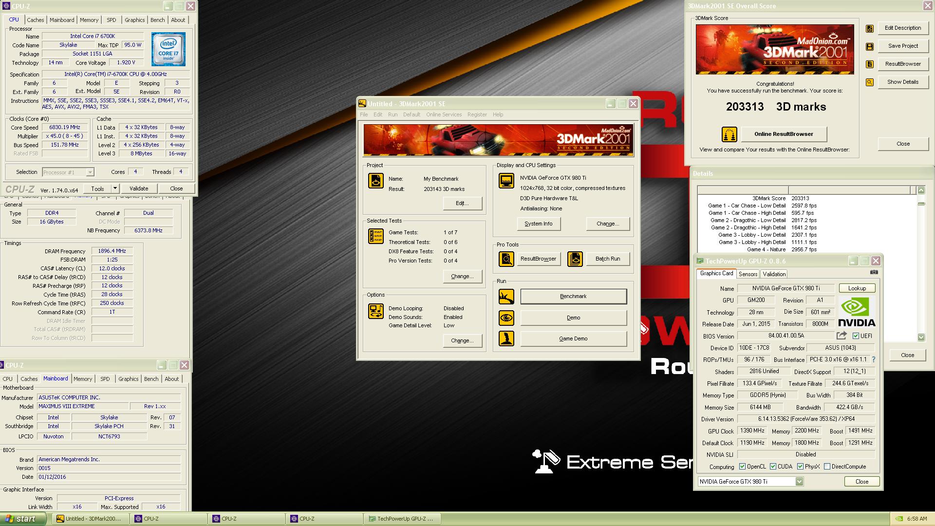 Оверклокер Dancop известен тем, что владеет процессором Intel Core i7-6700K с уникальным разгонным потенциалом. Поэтому все бенчмарки, в которых первую скрипку играют CPU с четырьмя ядрами, оказываются под прицелом Даниэля. В старом тесте 3DMark2001 SE немецкий мастер разгона побил собственный рекорд от 3 января (202510 очков). Новый результат 203313 «попугаев» — следствие повышения частоты Core i7-6700K до 6,83 ГГц под жидким азотом. В то же время видеокарта Asus GeForce GTX 980 Ti Matrix Platinum на штатном охлаждении работала в «щадящем» режиме: частота ядра составляла 1390 МГц, памяти GDDR5 — 8800 МГц (эффективная).