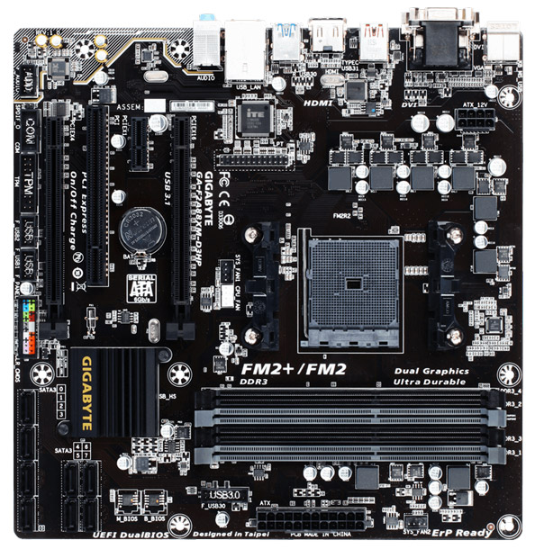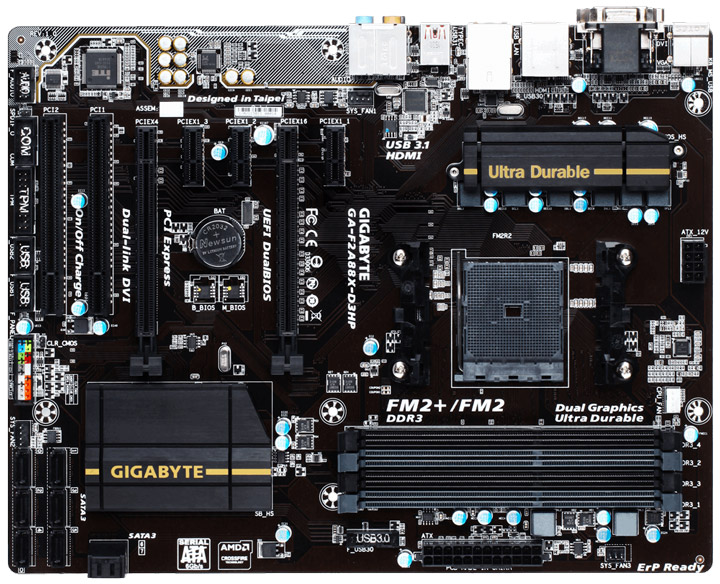 Gigabyte GA-F2A88X-D3HP имеет 5-6 фаз питания гнезда для APU/CPU (транзисторы, как и набор логики, охлаждаются радиатором), четыре слота для оперативной памяти DDR3-1333/.../2400 (до 64 ГБ ОЗУ), слоты PCI Express 3.0 x16, PCI Express 2.0 x16@x4 (CrossFire поддерживается), PCI-E 2.0 x1 (3 ед.) и PCI (2 ед.) для карт расширения, восемь портов SATA 6 Гбит/с с возможностью построения RAID 0, 1, 5, 10 и JBOD, коннекторы USB 3.0, USB 2.0, COM, TPM и другие. Контроллеры Realtek RTL8111x и ALC892 отвечают за сеть и звук.