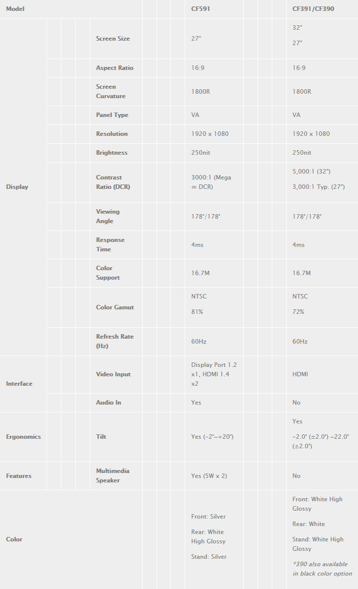 Samsung CF591 отличается от собратьев расширенным охватом цветового пространства NTSC (81%), наличием стереодинамиков и видеовхода DisplayPort 1.2, наряду с двумя HDMI версии 1.4. 32-дюймовый дисплей CF391 выделяется повышенной контрастностью (5000:1 против 3000:1 у других новых мониторов).