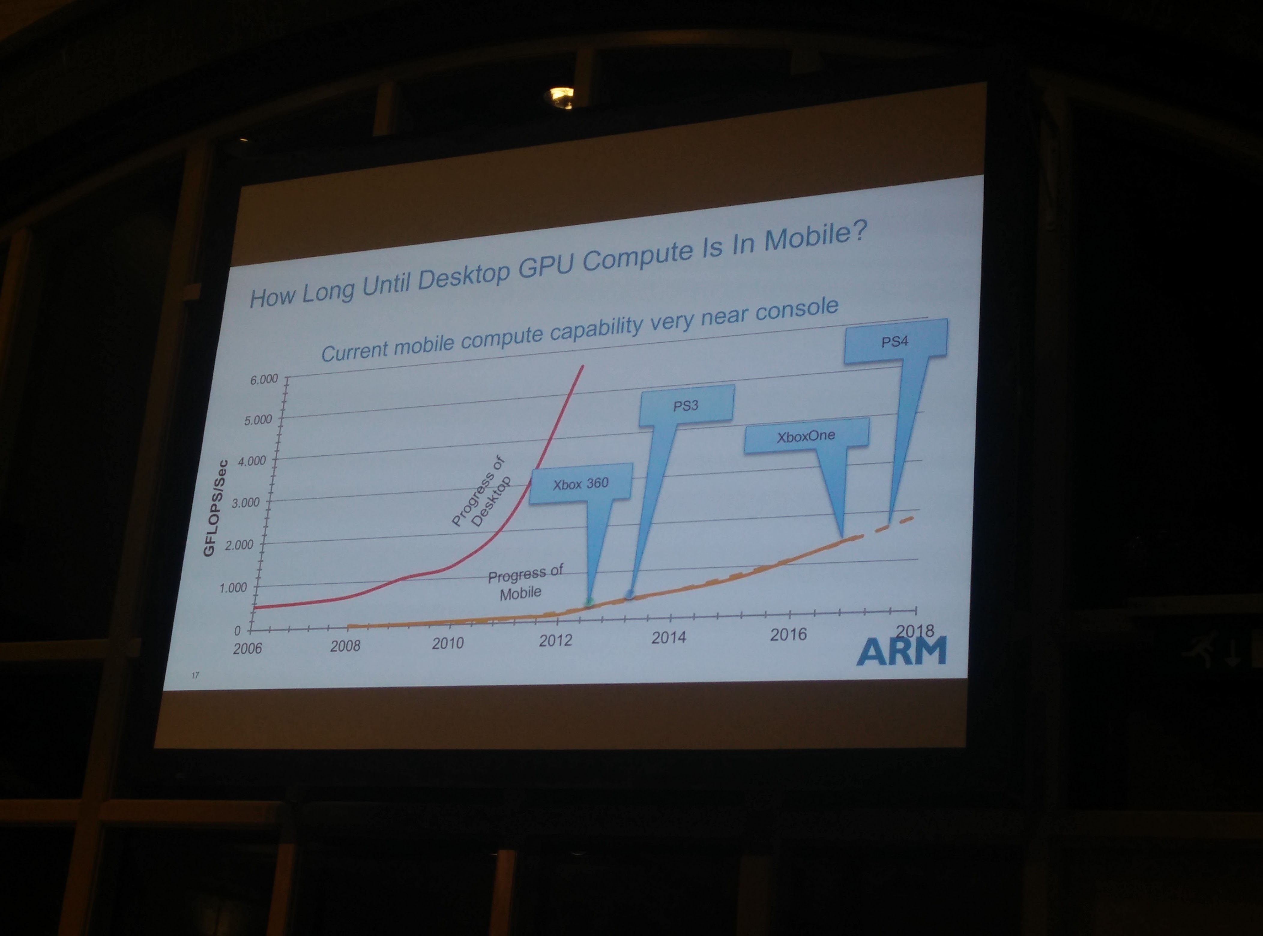 Дабы не быть голословным, Ромдан продемонстрировал график, показывающий вычислительную мощность консолей в флопс (количество операций с плавающей точкой в секунду). Производительность PS4 находится на уровне 1,84 Тфлопс, а производительность мобильных процессоров, согласно графику, к последней четверти 2017 года достигнет 2 Тфлопс.