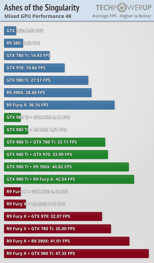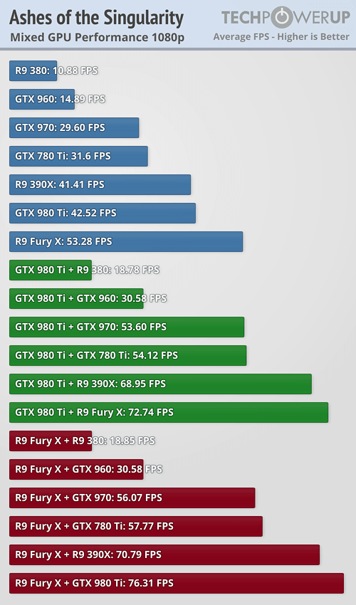 Инди-проект Ashes of the Singularity от Oxide Games является одной из первых DirectX12-игр и, благодаря свойствам данного API от Microsoft, может запускаться на GPU GeForce и Radeon, работающих в паре. Тестирование различных связок «GeForce+Radeon», а также неоднородных конфигураций SLI (например, GTX 980 Ti + GTX 780 Ti) и CrossFire, провел ресурс TechPowerUp.