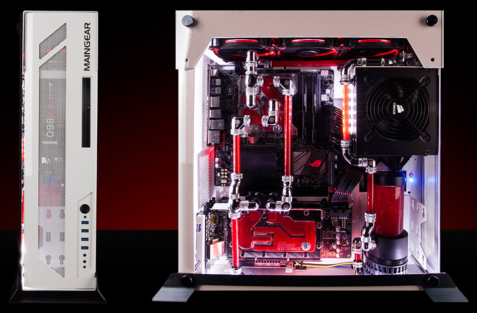 Maingear предлагает VR-энтузиастам выбрать между оригинальным десктопом F131 стоимостью от $1800 и мощным ноутбуком Nomad VR по цене $2800 и выше. Модель F131 в минимальной конфигурации оснащается четырехъядерным процессором Intel Core i5-6500 (3,2/3,6 ГГц), охлаждаемым СВО, 8 ГБ (2x 4 ГБ) оперативной памяти HyperX Fury DDR4-2666, видеокартой Radeon R7 360 (к VR-совместимым отнесены модели GeForce GTX 970 и старше), 750 Вт блоком питания EVGA серии SuperNova, 250 ГБ SSD Samsung 850 Evo и 2 ТБ жестким диском Seagate (7200 об/мин). Любой из вышеназванных узлов можно заменить более производительным.