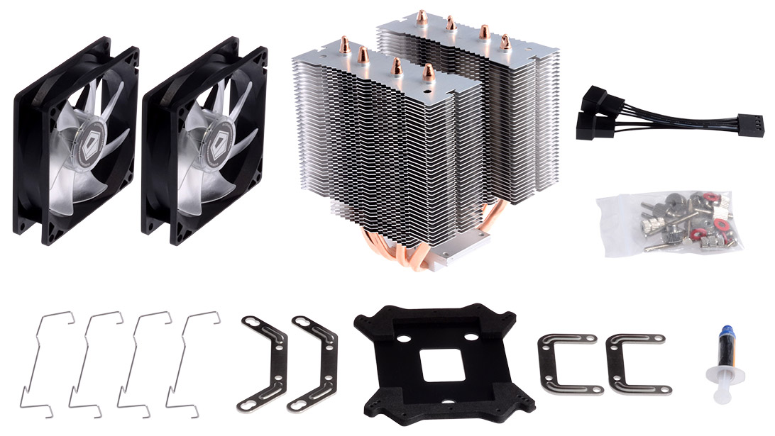 В состав ID-Cooling SE-904Twin входят четыре 6-мм медные тепловые трубки U-образной формы, контактирующие с крышкой CPU, алюминиевое основание (прижимная пластина), идентичные по форме секции алюминиевых пластин и пара одинаковых 92-мм вентиляторов на гидродинамическом подшипнике. «Карлсоны» работают в режиме 600—2200 об/мин. Каждый из них издает 14—23,8 дБА шума и характеризуется производительностью до 65,5 м³/ч.