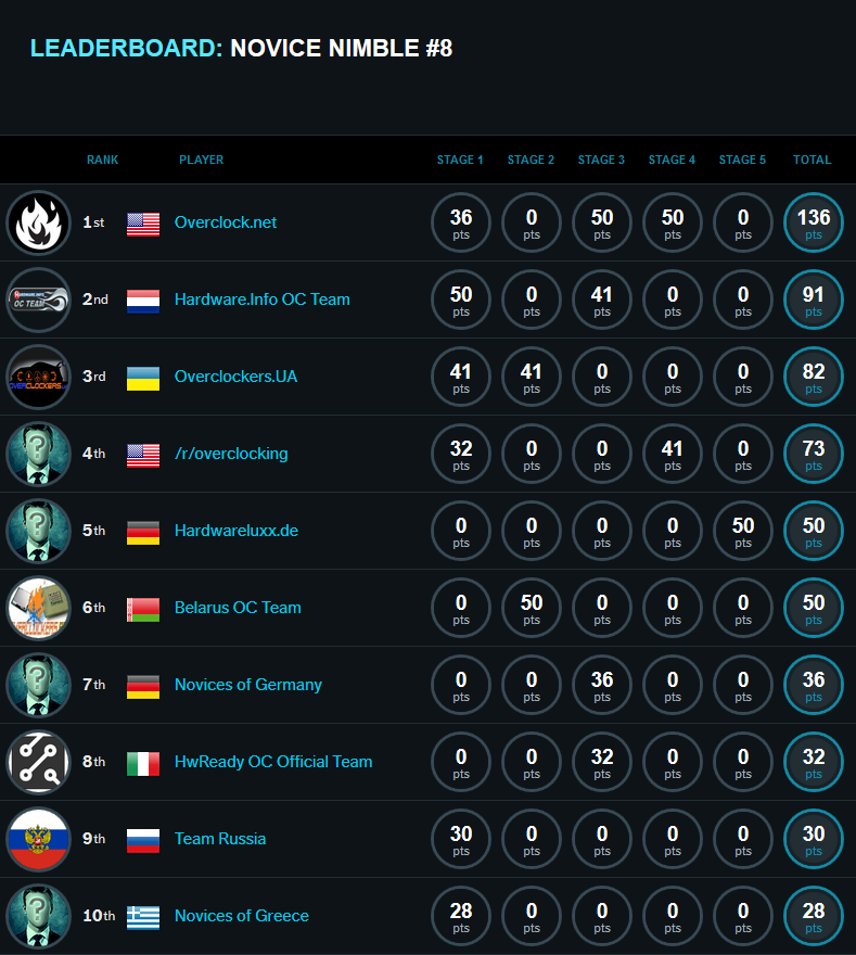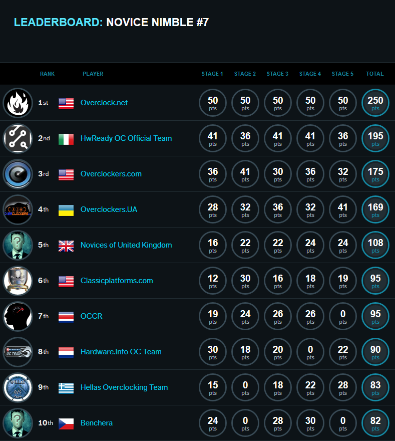 Сегодня ресурс HWBot.org подвел итоги проводившегося с 16 января по 5 марта на OC eSports командного состязания новичков мира соревновательного бенчмаркинга Novice Nimble 7. Тщательная проверка результатов привела к появлению «баранок» у некоторых команд, впрочем, на состав лидирующей группы это не повлияло: золото снова оказалось у Overclock.net (№7 из 3378 команд в мире), серебро завоевали итальянцы HwReady OC (№93), бронза — у Overclockers.com (№6). Немного отстав от победителей, четвертой финишировала команда Overclockers.UA, находящаяся в шаге от топ-20 среди всех команд мира.