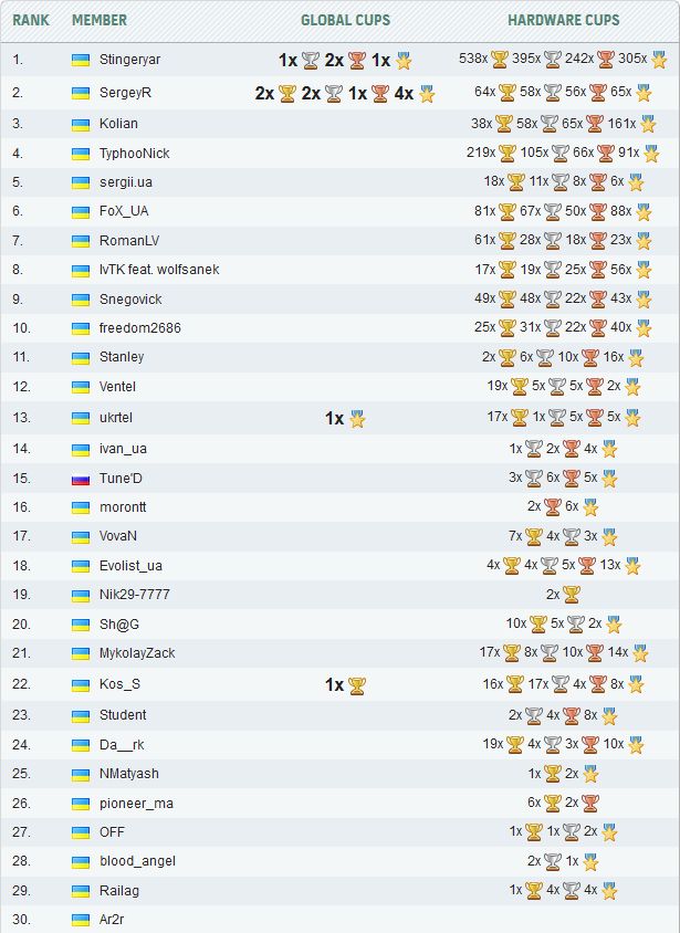 Капитан Oveclockers.UA StingerYar и один из наиболее активных участников TyphooNick на двоих завоевали больше половины общего количества золотых кубков — 538 и 219 соответственно. Третье место по данному показателю у FoX_UA (81). SergeyR — явный лидер по глобальным достижениям.