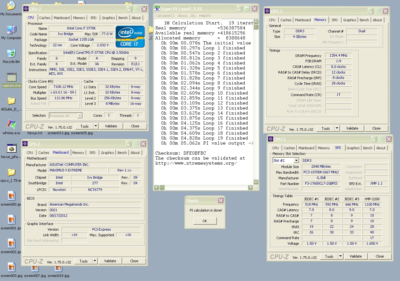 Четырехъядерник Ivy Bridge работал на одном ядре и был подвергнут разгону до 7108 МГц на материнской плате Asus Maximus V Extreme, использующей чипсет Z77. Память G.Skill Pi стандарта DDR3, как и процессор, охлаждалась жидким азотом. В комментарии к результату Riska поблагодарил своего соотечественника Zzolio, который поделился с ним необходимым объемом LN2.