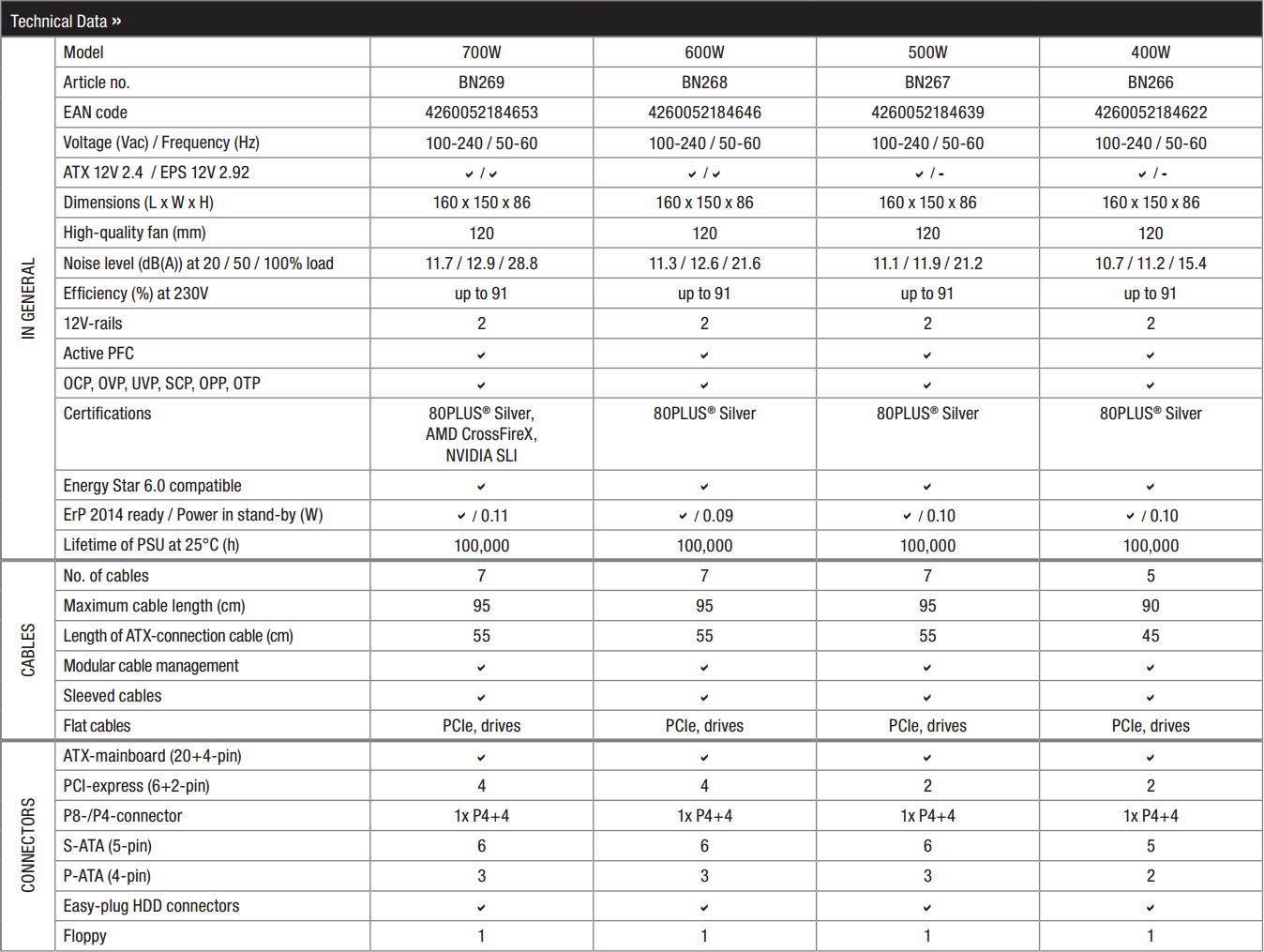 Отметим, что старшие источники питания, рассчитанные на постоянную нагрузку в 600 и 700 Вт, позволяют запитать четыре 8-контактных разъема PCI-E Power, а младшие решения — два таких разъема. Количество разъемов SATA Power составляет 6 шт. (у 400 Вт модели — 5 шт.). Кроме того, имеется единичный (4+4)-контактный EPS12V.