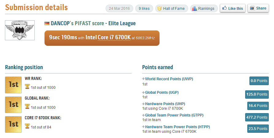 Оверклокер №1 в мире Даниэль «Dancop» Шир после неудачи в квалификации G.Skill OC World Cup 2016 решил снова проверить свои силы в зачетной дисциплине PiFast, и на этот раз ему сопутствовала удача: результата 9,19 с прежде не удавалось достичь никому.