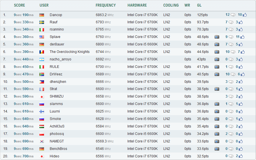 Рекорд был установлен на частоте CPU Core i7-6700K в 6863 МГц, при отключенном Hyper-Threading. Двухканальный комплект оперативной памяти G.Skill Trident Z DDR4 общим объемом 16 ГБ работал в режиме DDR4-4065 с таймингами 12-12-12-28 и Command Rate 1T. Серия экспериментов проводилась на материнской плате Asus Maximus VIII Impact (Z170), запитанной от БП Seasonic Platinum номиналом 1200 Вт.