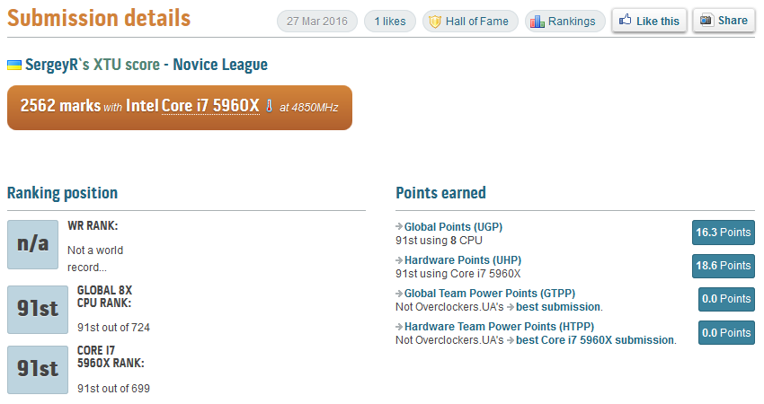 Соревнование «Путь чемпионов» для участников HWBot-команды Overclockers.UA близится к развязке, и оверклокеры со всей Украины выкладывают свои козыри (результаты) в преддверии дедлайна, 31 марта. SergeyR — один из тех, кто не нуждается в дополнительной мотивации, равно как и в отдельном представлении. Накануне вечером киевлянин показал высокий результат в бенчмарке Intel XTU — 2562 очка на процессоре Core i7-5960X, «засветившись» на главной странице HWBot.org.