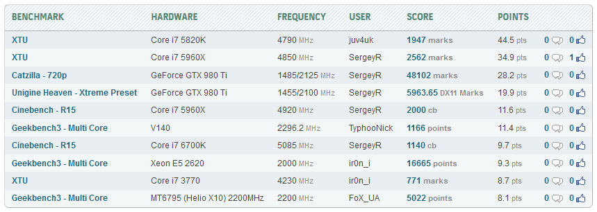 Несколькими днями ранее, в прошлый четверг, новый участник коллектива Overclockers.UA под ником Juv4uk заработал 44,5 GTPP-очка, набрав 1947 очков в том же тесте XTU, но на более слабом процессоре — Core i7-5820K. Это достижение стало лучшим внутрикомандным результатом последних дней.