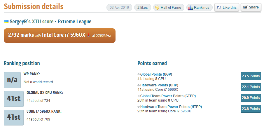 Из последних достижений Сергея стоит выделить его 2792 очка в XTU — результат, попавший в топ-10 всех результатов понедельника. Разгон процессора Core i7-5960X под жидким азотом на плате Asus Rampage V Extreme составил 5,36 ГГц.