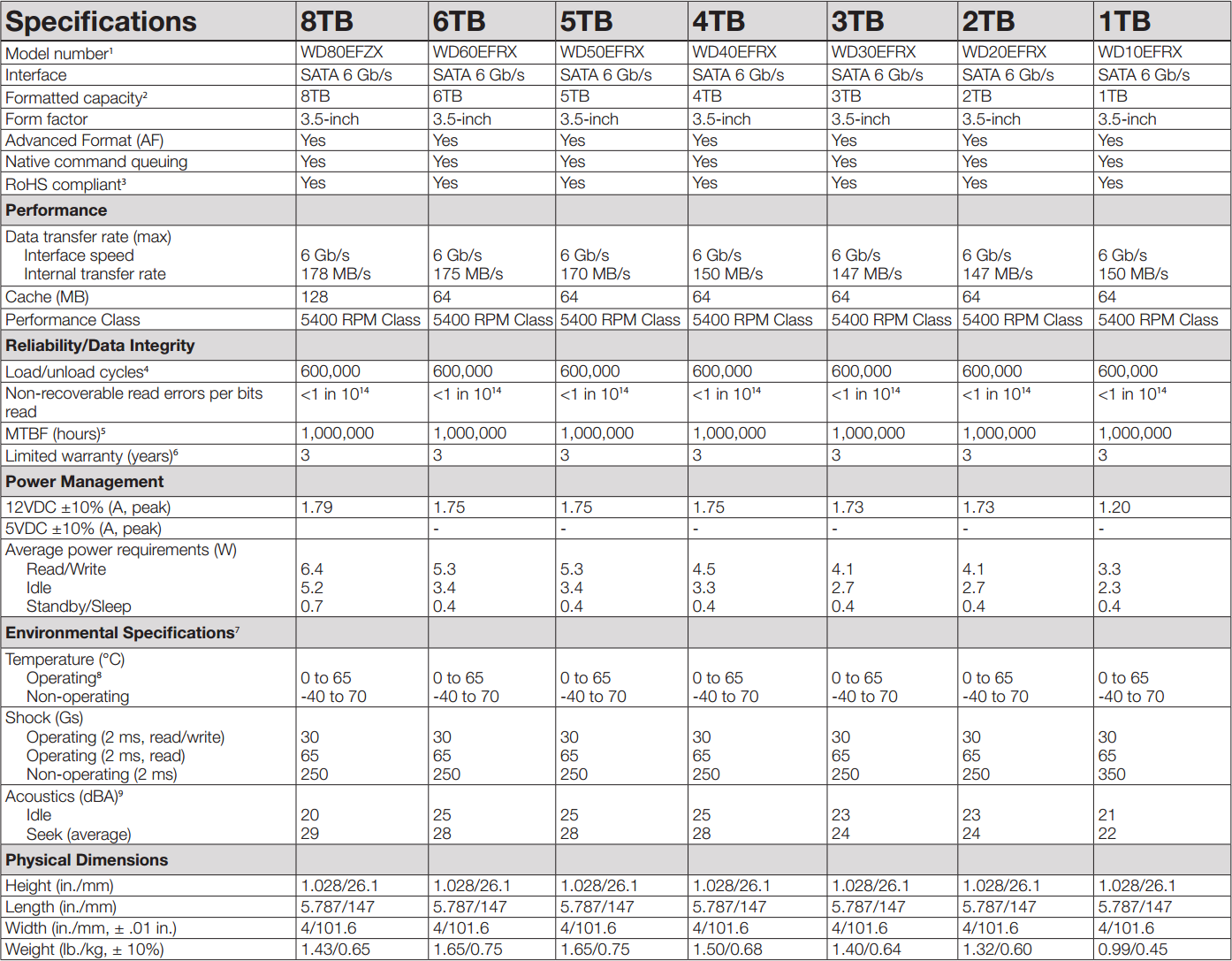 В спецификации WD80EFZX указано, что скорость последовательного чтения у данной модели составляет 178 МБ/с, уровень шума при поиске — 29 дБА, а энергопотребление — 6,4 Вт (при чтении/записи). Жесткий диск заполнен гелием, что позволило разместить семь пластин в 3,5-дюймовом корпусе обычной толщины — 26,1 мм.