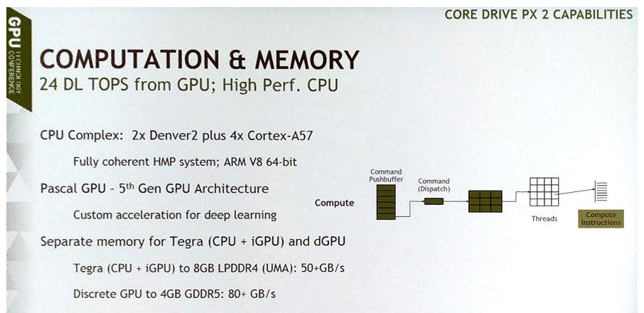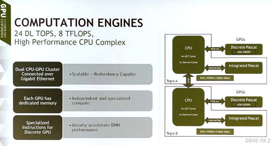 Судя по всему, для Drive PX 2 «зеленые» готовят относительно скромные GPU (условно GP106 или GP107), которые могут применяться в ноутбуках и настольных видеокартах для массового покупателя. Косвенно на это указывает малая пропускная способность подсистемы памяти — всего 80 ГБ/с, что, применительно к GDDR5, соответствует эффективной частоте микросхем в 5 ГГц при 128-битной шине.