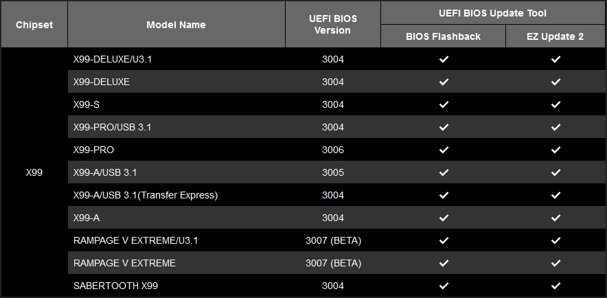 Все актуальные модели плат Asus X99 поддерживают оба способа обновления UEFI. Отметим, что прошивки для M/B Rampage V Extreme и Rampage V Extreme/U3.1 пока пребывают в статусе beta.