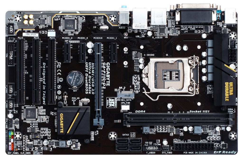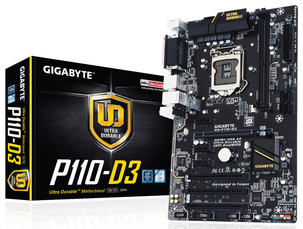 Инженеры Gigabyte подготовили материнскую плату GA-P110-D3 на чипсете Intel H110, предназначенную, судя по сочетанию интерфейсов, для апгрейда офисных ПК, имеющих «древнюю» периферию и карты расширения PCI. На базе данной ATX-модели можно собрать как высокопроизводительную систему (процессор Core i7 линейки Skylake-S, до 32 ГБ памяти DDR4-2133, M.2 SATA SSD, видеокарта поколения PCI-E 3.0), так и обычную «печатную машинку» с CPU Celeron и жестким диском SATA.