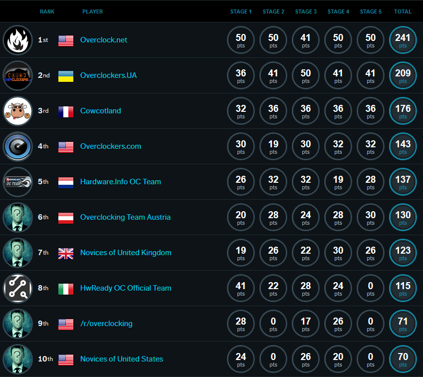 С 1 по 30 апреля на оверклокерском ресурсе OC eSports (проект HWBot.org) проходил восьмой командный турнир для новичков Novice Nimble, в котором честь команды Overclockers.UA защищали Da_rk, Kos_S, MykolayZack и SergeyR. Почти все время наша команда шла на первом месте, но ближе к концу соревнования ее опередил интернациональный коллектив Overclock.net.