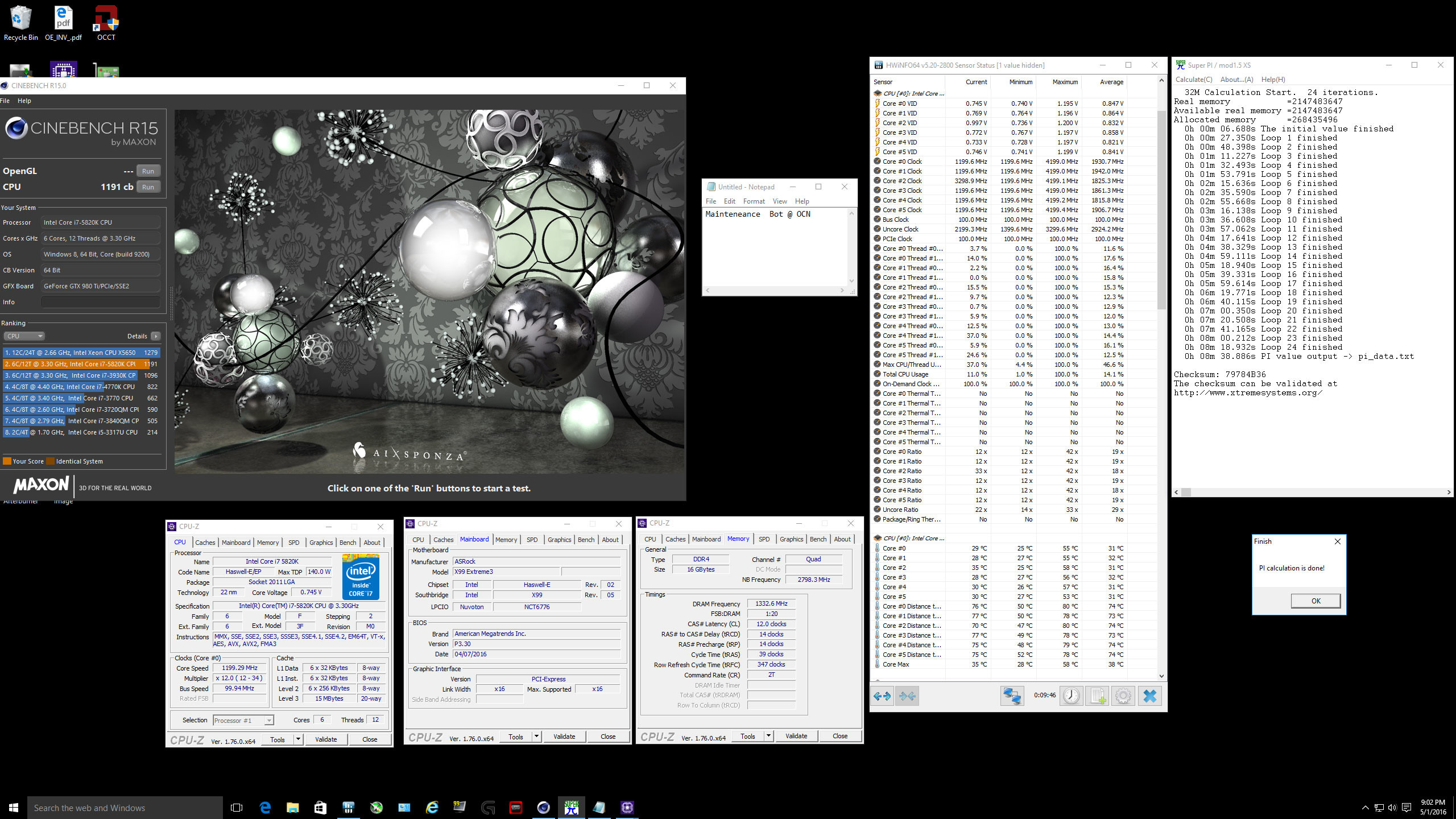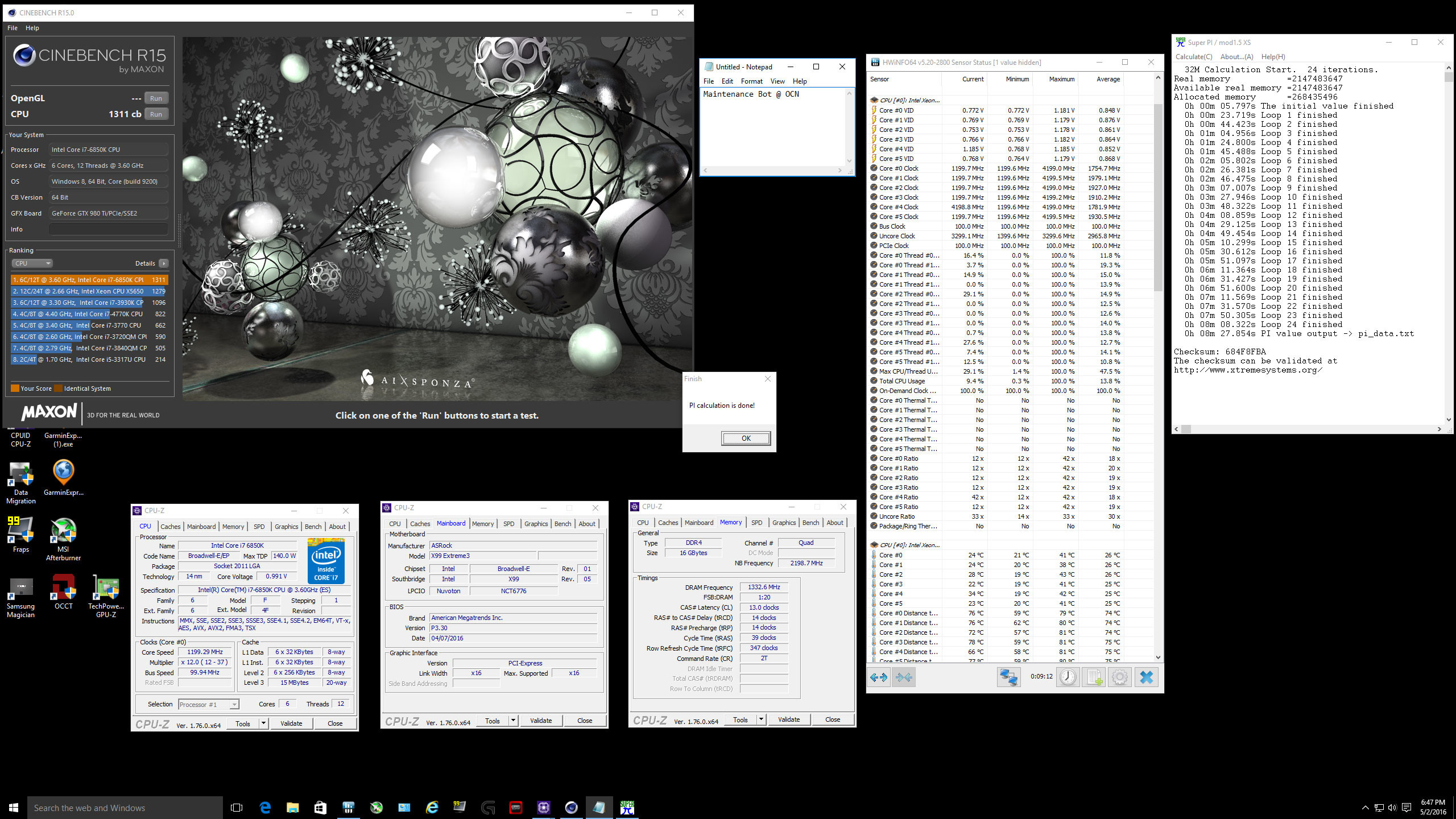 Cinebench R15: Core i7-6850K показывает на 10% более высокий балл. Для проверки производительности на ядро оба процессора прошли тест SuperPi 32M. Core i7-6850K выполнил вычисления за 08:27,854, а Core i7-5820K — за 08:38,886.