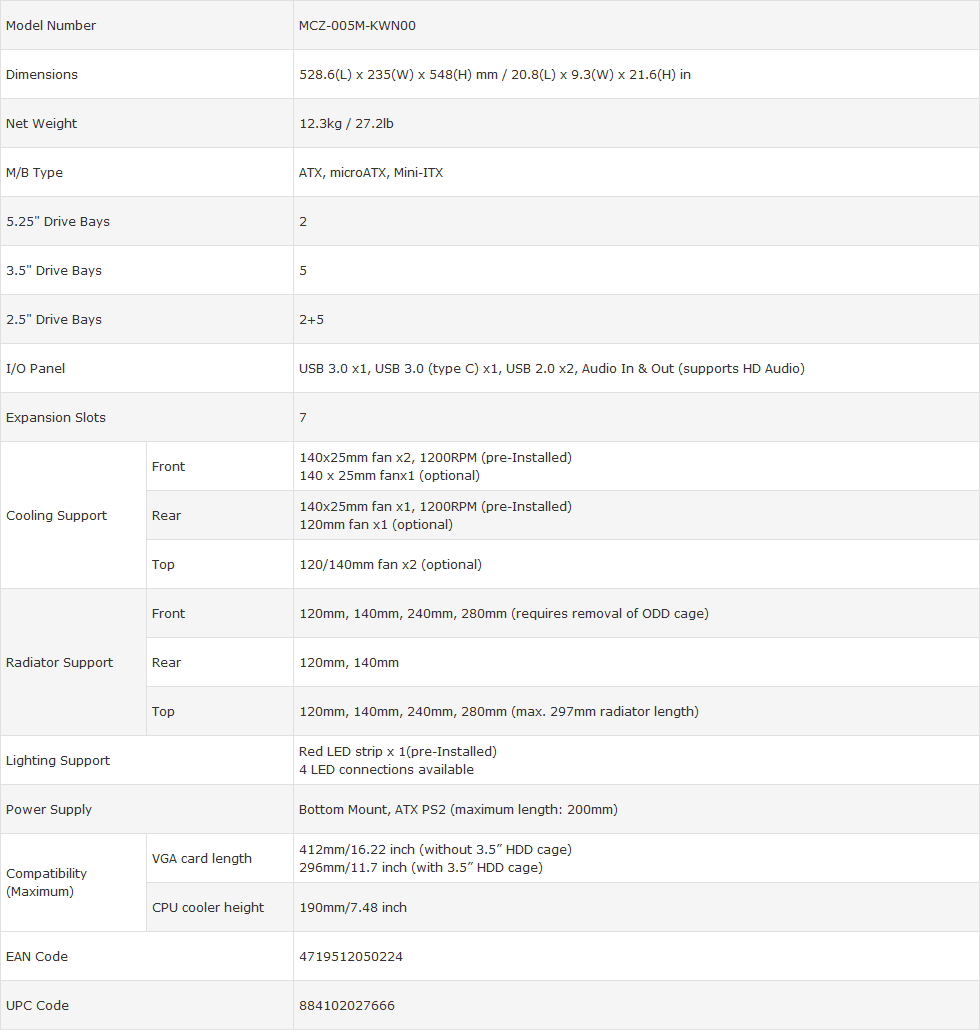 MasterCase Maker 5 в основном унаследовал дизайн прошлогодних моделей, но при этом также включает пятиканальный реобас, декоративную дверцу, ленту с красными светодиодами и внутреннюю «обивку» из шумопоглощающего материала. Дизайн панели I/O изменился в лучшую сторону. Кстати, на ней теперь имеется порт USB 3.0 Type-C, наряду с USB 3.0 и USB 2.0 (2 шт.).