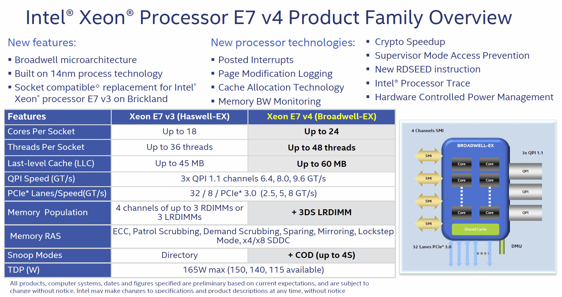 Компания Intel расширила обширное семейство серверных процессоров с 14-нанометровой архитектурой Broadwell моделями Xeon E7 v4 (Broadwell-EX) для high-end серверов на базе материнских плат с 4–8 сокетами.