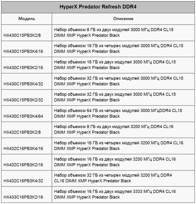 Новинки HyperX Predator DDR4 работают в режиме DDR4-3000, DDR4-3200 и DDR4-3333, имеют общий объём от 8 до 64 Гбайт, задержки CL15–CL16 и штатное напряжение 1,35 В.