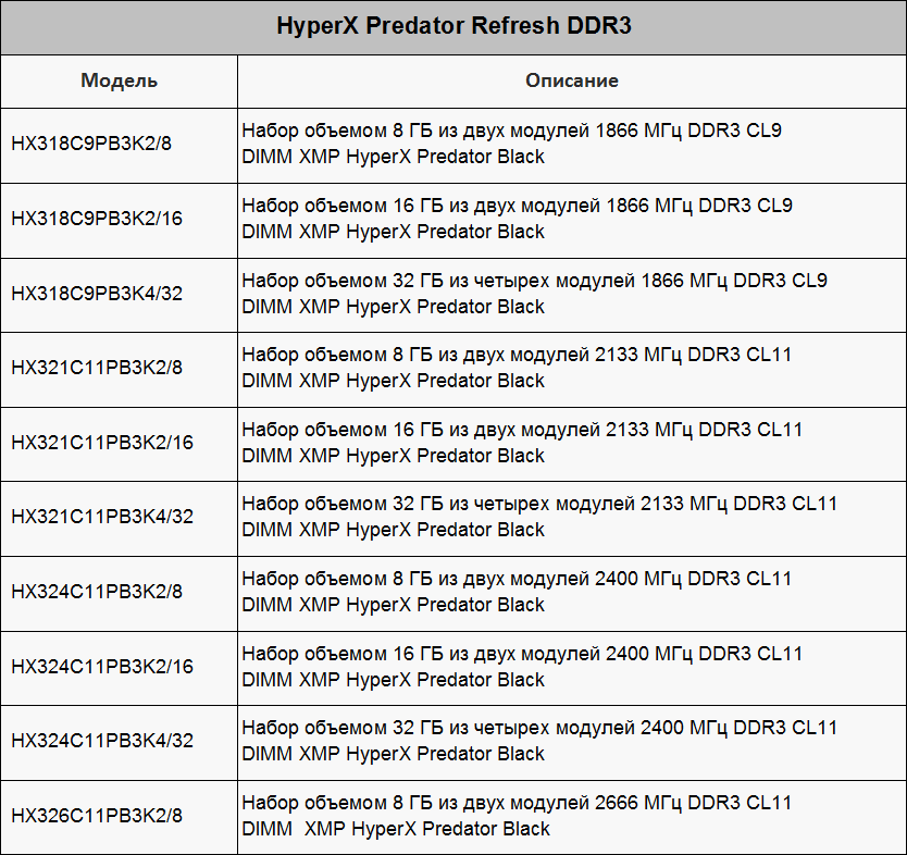 Для новых комплектов HyperX Predator DDR3 характерны эффективные частоты от 1866 до 2666 МГц, объём 8–32 Гбайт, латентность CL9–CL11, напряжение питания 1,5–1,65 В.