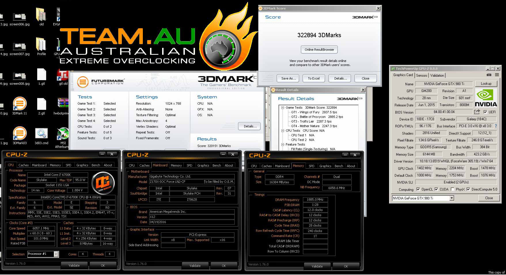 Команда TeamAU отобрала у Dancop глобальное первое место в тесте 3DMark03. Процессор Intel Core i7-6700K (@6,67 ГГц) и тандем SLI из видеокарт Galax GeForce GTX 980 Ti HOF (~1650/8800 МГц) позволили австралийцам набрать почти 322,9 тыс. «попугаев» в старом бенчмарке от Futuremark.
