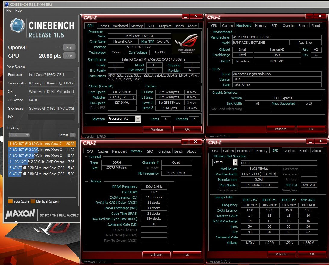 Xtreme Addict подобрался к оверклокерскому Олимпу на расстояние менее 410 очков: у поляка их 2914,5, а у Dancop — 3324,3. Михал отличился тем, что «выбил» на процессоре Intel Core i7-5960X 26,68 очка Cinebench R11.5. Восьмиядерный Haswell-E подвергся разгону до 6012,8 МГц на материнской плате Asus Rampage V Extreme.