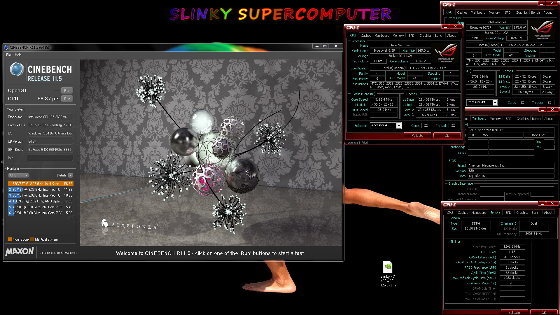 Slinky PC не устоял перед соблазном запустить ряд процессорных бенчмарков на 2P-плате Asus Z10PE-D8 WS (чипсет C612). С помощью двух мощных 22-ядерных CPU Xeon E5-2699 v4 американец набрал внушительные 56,87 очка в Cinebench R11.5 и 15125,6 пункта в HWBot Prime.